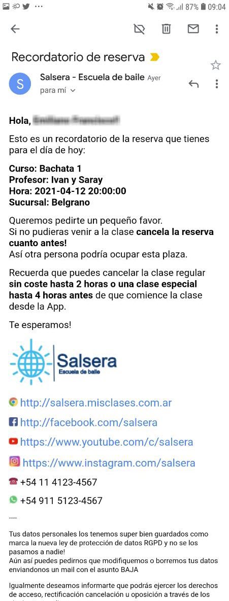 Recordatorio/confirmaciones por email